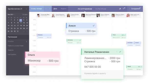 График визитов клиентов в удобном календаре. Запись клиентов в 3 клика. Доступно на всех устройствах