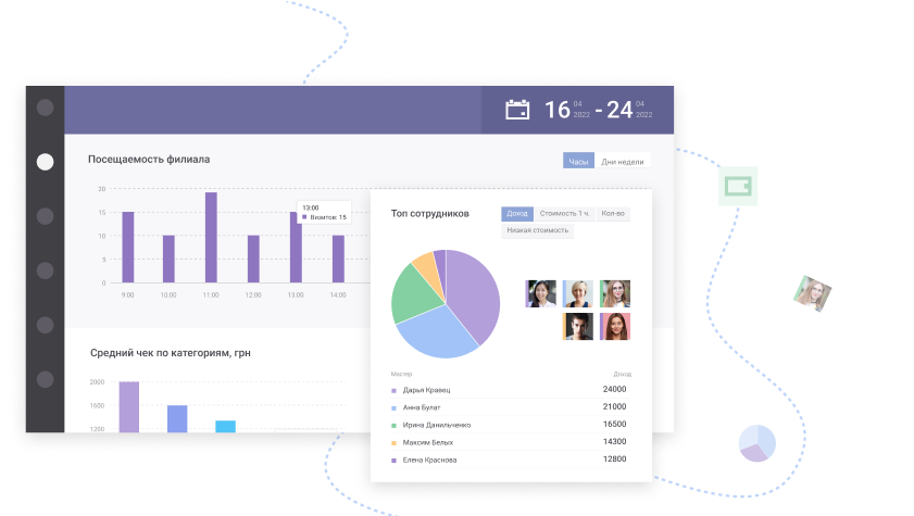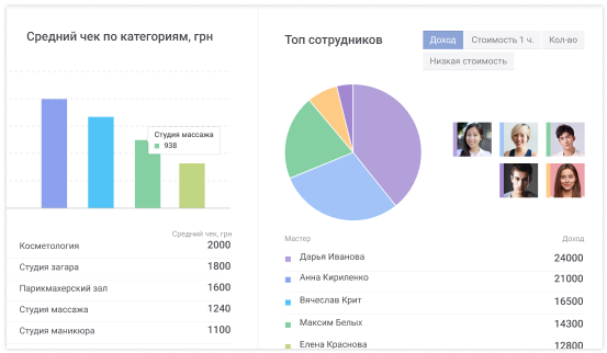 Вся информация для владельца на ладони: самые востребованные сотрудники, самые популярные услуги, часы и дни загрузки заведения; отчеты по нестандартным визитам